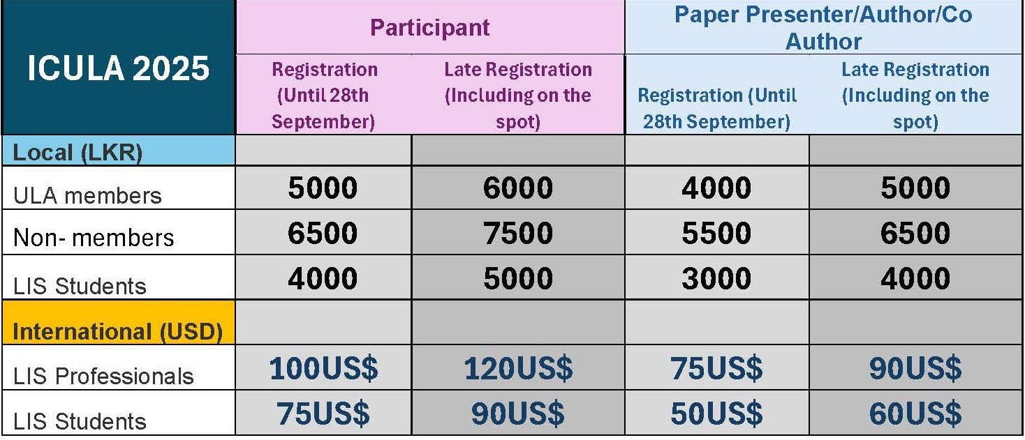 The presenting authors and all participants of ICULA 2025 must register for the conference using the registration form given below. Registration for the conference includes a non-refundable registration fee. Please fill the registration form below.